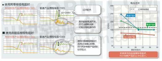 通過(guò)元器件內(nèi)部?jī)?yōu)化,實(shí)現(xiàn)了ON/OFF順暢切換的軟開(kāi)關(guān)。由此,開(kāi)關(guān)時(shí)產(chǎn)生的電壓過(guò)沖與普通產(chǎn)品相比減少了50%,可減少用來(lái)抑制過(guò)沖的外置柵極電阻和緩沖電路等部件數(shù)量。使用IGBT時(shí),應(yīng)用端不再需要以往需要的過(guò)沖對(duì)策,有利于減輕設(shè)計(jì)負(fù)擔(dān)。