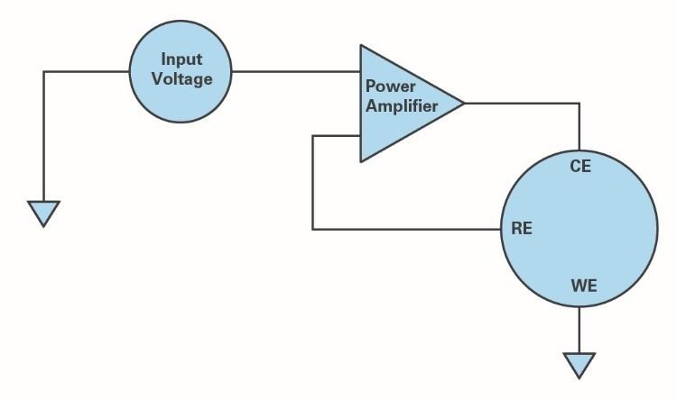最基本和常用的測量原理是基于恒電勢器。如圖1所示,恒電勢器測量和控制工作電極(WE)和參考電極(RE)之間的電壓。通過調(diào)節(jié)流過計數(shù)器或輔助電極的電流,工作電極的電勢相對于參考電極保持恒定。