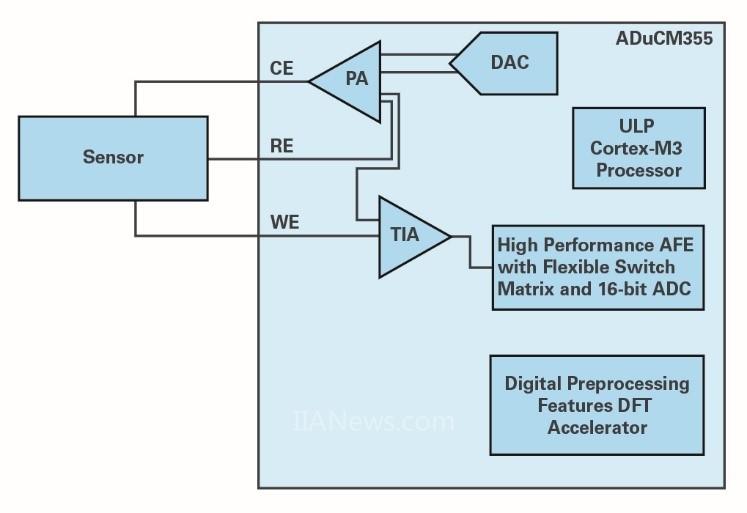 最簡單的電流測量方法是對傳感器施加偏置電壓并測量響應(yīng)電流。其中,在RE和WE之間施加一個恒定電壓,然后使用電流-電壓轉(zhuǎn)換器和模數(shù)轉(zhuǎn)換器(ADC)將電流剖面轉(zhuǎn)換為數(shù)字信號。這個電流剖面取決于傳感器和被測變量。圖2利用ADuCM355描述了這個電路。