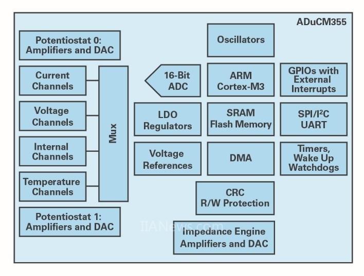 它以極低的功耗控制電化學(xué)和生物傳感器。這款基于ARM? Cortex?-M3處理器技術(shù)的芯片具有電流、電壓和電阻測量功能。除了一個具有帶輸入緩沖器的16位400 kSPS多通道SAR ADC以外,還具有集成式抗混疊濾波器(AAF)和可編程增益放大器(PGA)。電流輸入中的跨阻放大器(TIA)具有可編程增益和負載電阻,支持不同的傳感器類型。AFE還包含專門針對恒電勢器設(shè)計的放大器,以相對于外部電化學(xué)傳感器保持恒定的偏置電壓。可以通過ADC上游的輸入多路選擇模塊選擇相應(yīng)的輸入通道。這些輸入通道包括三個外部電流輸入、多個外部電壓輸入和內(nèi)部通道。三個電壓DAC中有兩個是雙輸出DAC。DAC的第一個輸出可控制恒電勢器放大器的同相輸入,另一個控制TIA的同相輸入。第三個DAC(有時被稱為高速DAC)針對用于阻抗測量的高性能TIA而設(shè)計。此DAC的輸出頻率范圍高達200 kHz。ARM Cortex-M3處理器還具有靈活的多通道直接存儲器訪問(DMA)控制器,支持兩個獨立的串行外設(shè)接口(SPI)端口、通用異步接收器/發(fā)射器(UART)和I2C通信外設(shè)??梢愿鶕?jù)需要為特定應(yīng)用配置一系列通信外設(shè)。這些外設(shè)包括UART、I2C、兩個SPI端口和通用輸入/輸出(GPIO)端口。這些GPIO可以與通用定時器相結(jié)合,生成脈沖寬度調(diào)制(PWM)輸出。
