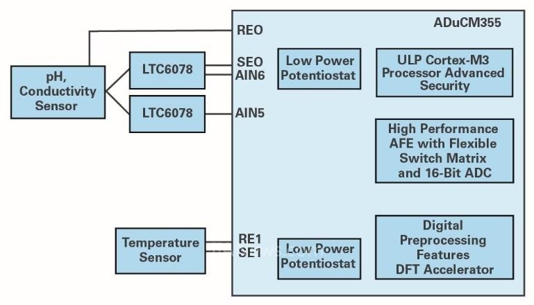 圖5.使用ADuCM355測量pH值、溫度和電導(dǎo)率的電路