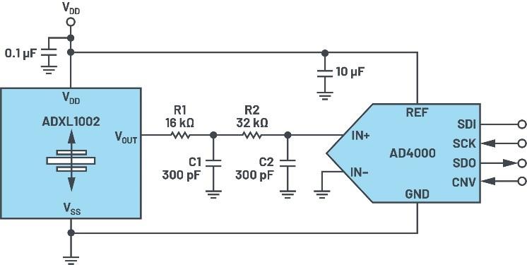圖1顯示的是一個示例電路。來自ADXL1002的模擬輸出信號通過2階RC濾波器饋送至逐次逼近寄存器(SAR)模數(shù)轉(zhuǎn)換器(ADC) AD4000,將模擬信號轉(zhuǎn)化為數(shù)字值,以進(jìn)一步處理信號。