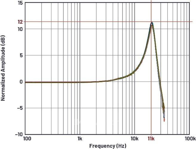 加速度計的頻率響應(yīng)是該系統(tǒng)最重要的特性,具體如圖2所示。在頻率高出約2 kHz至3 kHz時,增益增加。對于諧振頻率(11 kHz),在輸出電壓下產(chǎn)生約12 dB(因子為4)的最大增益值。