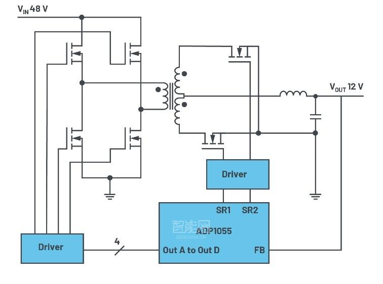 圖1.全橋應(yīng)用中的ADP1055數(shù)字開關(guān)穩(wěn)壓器
