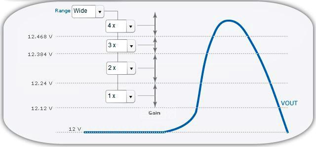 在圖3的示例中,設(shè)置的標(biāo)稱輸出電壓為12 V??烧{(diào)控制環(huán)路增益可以設(shè)置為多個(gè)值,具體由輸出電壓決定。例如,如果因?yàn)檎`差放大器的增益增加,使得電壓升高至12.12 V以上,則可以在對(duì)應(yīng)的下拉菜單中設(shè)置控制環(huán)路。還有三個(gè)其他的電壓閾值高于12.12 V,可以使用獨(dú)立的增益設(shè)置。注意,這些增益設(shè)置與在設(shè)計(jì)穩(wěn)壓環(huán)路時(shí)設(shè)置的極點(diǎn)和零完全無關(guān)。