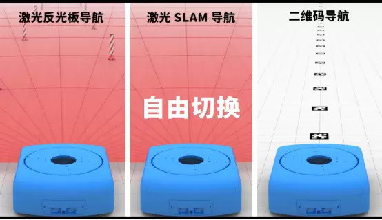 答:激光 SLAM 導航,激光反光板導航,二維碼導航,三者可以自由切換。