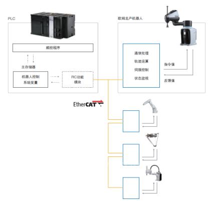 將機(jī)器人控制整合至PLC,在保持機(jī)器人自身的高速性、高精度的同時(shí),可以與其他設(shè)備一樣使用PLC,通過EtherCAT對機(jī)器人進(jìn)行控制。