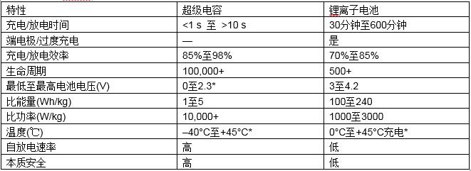 靜電雙層電容(EDLC)或超級電容(supercaps)都是有效的儲能設備,可以彌補更大更重的電池系統(tǒng)和大容量電容之間的功能差距。相比可充電電池,超級電容能夠承受更快速地充放電周期。因此在電能相對較低的備用電源系統(tǒng)、短時充電系統(tǒng)、緩沖峰值負載電流系統(tǒng)和能量回收系統(tǒng)中,超級電容用于短期儲能比電池更好(參考表1)。在現(xiàn)有的電池-超級電容混合系統(tǒng)中,超級電容的高電流和短時電源功能是對電池的長持續(xù)時間、緊湊儲能功能的有效補充。