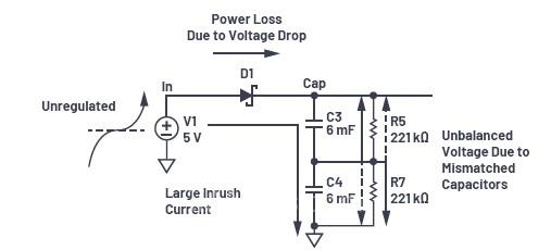 圖1.過度簡單的設計導致超級電容充電方案存在風險的示例