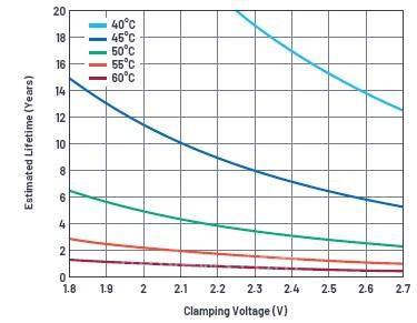 圖2.使用壽命與嵌位電壓的關系圖(以溫度作為關鍵參數(shù))