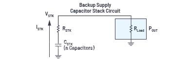 關于設計中的可用電能有一些提示說明。由于堆疊式超級電容的ESR固定不變,所以在備份操作期間唯一變化的值就是堆棧電壓,當然也包括堆棧電流。