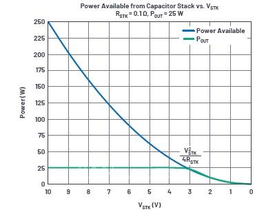 圖5顯示可用功率與VSTK的函數(shù)關系圖,假設最優(yōu)電阻與負載匹配,備用功率為25 W。此圖也可以視為無單位時基:當超級電容滿足所需的25 W備份功率時,超級電容向負載放電,堆棧電壓隨之降低。在3 V時,存在一個拐點,此時負載電流高于最優(yōu)水平,導致負載的可用備用功率降低。這是系統(tǒng)的最大輸出功率點,就在這個點,超級電容的ESR損失增加。在這個示例中,3 V明顯高于DC-DC轉(zhuǎn)換器的壓差,所以不可用電能完全由超級電容引起,導致調(diào)節(jié)器未得到充分利用。理想情況下,超級電容達到壓差,使得系統(tǒng)供電能力達到最高。