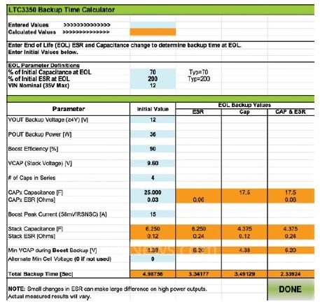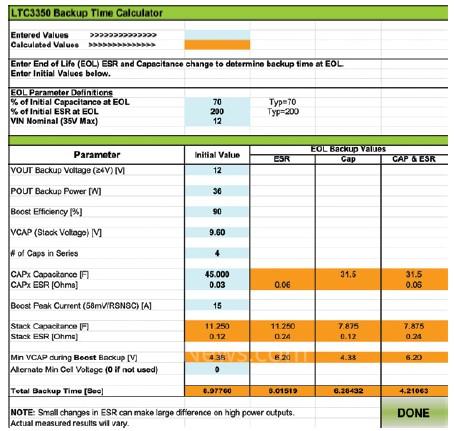 利用標稱值下的電能傳輸基礎知識,可以將計算滿足備用規(guī)格所需的電容值轉(zhuǎn)換為簡單的計算所需功率,以及存儲功率問題。遺憾的是,當您考慮最大功率傳輸、電容器的EOL電容和ESR的影響時,這種簡單的方法無法滿足要求。這些因素會極大地影響系統(tǒng)在整個壽命周期內(nèi)的可用電能。利用ADI的集成超級電容解決方案和大量可用的備份時間計算工具,模擬工程師可以胸有成竹地設計和構(gòu)建可靠的超級電容器備份/保持解決方案,不僅能夠在應用的使用壽命內(nèi)滿足設計要求,而且對成本的影響極小。