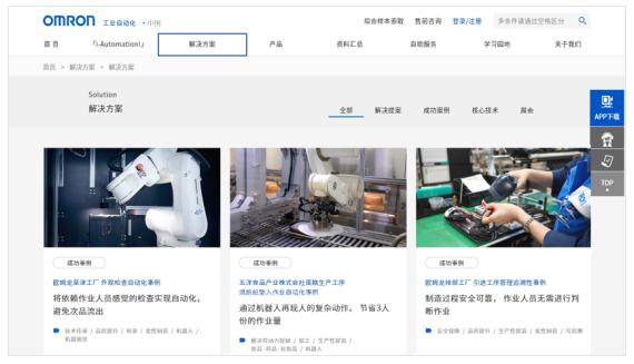 【解決方案】版塊包含解決提案、成功案例、核心技術(shù)、展會(huì)4方面內(nèi)容。展示了歐姆龍開發(fā)的許多最新應(yīng)用和核心技術(shù),希望客戶親身感受到歐姆龍基于工業(yè)自動(dòng)化事業(yè)的價(jià)值創(chuàng)造理念“i-Automation!”實(shí)現(xiàn)的制造革新的現(xiàn)在以及未來。