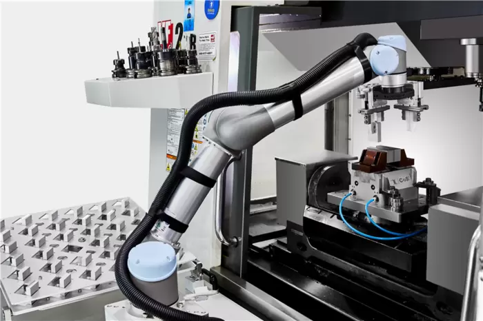 為了提升精密制造工廠的自動(dòng)化水平,制造商已經(jīng)開始在數(shù)控機(jī)床領(lǐng)域部署協(xié)作機(jī)器人。相比于傳統(tǒng)工業(yè)機(jī)器人,協(xié)作機(jī)器人的靈活性和安全性都更勝一籌。協(xié)作機(jī)器人采用輕量化設(shè)計(jì),外形小巧,即使需要改變工作流程,制造商也能對(duì)其進(jìn)行輕松快速地部署。