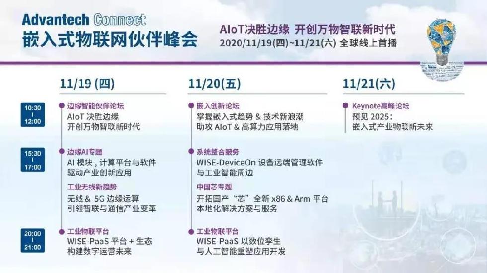 2020年11月19~21日的研華嵌入式物聯(lián)網(wǎng)伙伴峰會(huì),將首次以在線論壇的方式舉辦,并以邊緣智能、AI產(chǎn)業(yè)應(yīng)用、嵌入式物聯(lián)網(wǎng)為核心議題。 攜手全球頂尖產(chǎn)業(yè)伙伴共同探討AIoT新時(shí)代、新思路與最佳實(shí)踐。我們將規(guī)劃九大主題論壇,并邀請(qǐng)30位以上產(chǎn)官學(xué)伙伴專講,例如Intel、微軟,NXP、思謀以及中國(guó)信通院等產(chǎn)業(yè)專家,各位將從論壇中學(xué)習(xí)到AIoT 科技趨勢(shì)并透過(guò)伙伴的分享,激發(fā)物聯(lián)網(wǎng)實(shí)踐新思路。