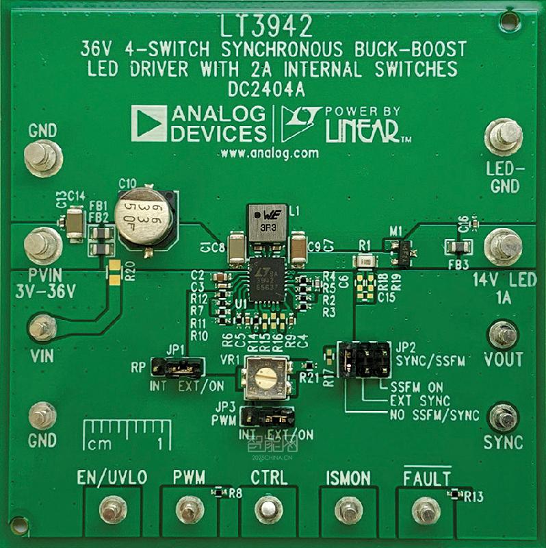 圖1.這款基于LT3942的演示電路(DC2404A)展示了一種高性能、緊湊型DC-DC穩(wěn)壓器解決方案,專門用來在這種情況下驅動LED。