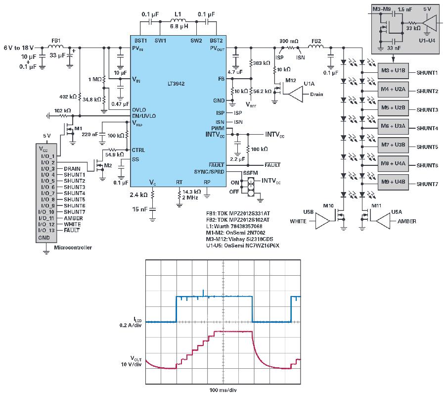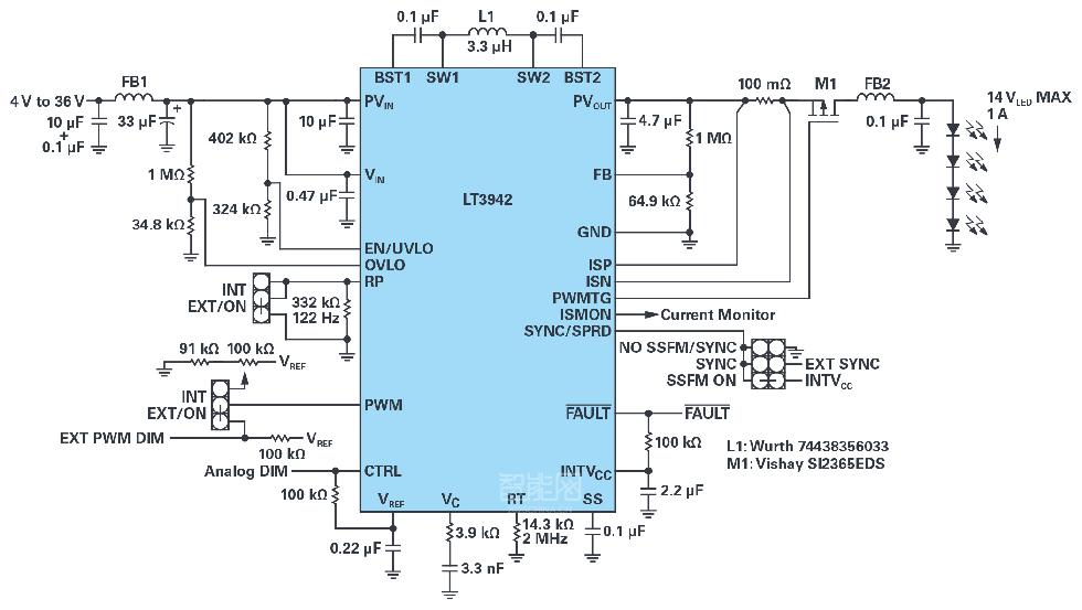 該解決方案還具有高帶寬工作性能,可以快速調節(jié)輸出電流。當在降壓模式下工作時,LT3942使用外部PWM源對LED進行100 Hz無閃爍調光,從而實現高達5000:1的調光比。