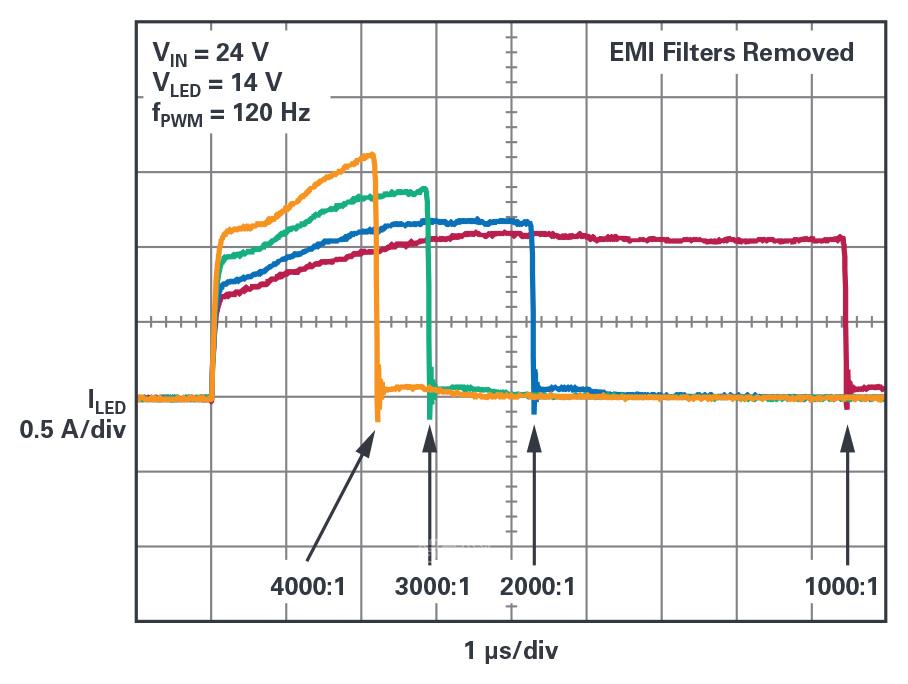 圖3.LT3942的高帶寬工作性能有助于LED照明應用在寬動態(tài)亮度范圍內實現高比率PWM調光。無需EMI濾波器,DC2404A在120 Hz時可實現高達4000:1的調光,而在100 Hz時則可實現高達5000:1的調光。