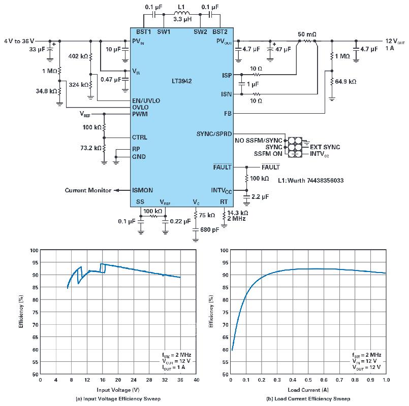 圖4中的效率曲線表明,即使工作開關頻率為2 MHz時,LT3942 12 V穩(wěn)壓器也具有接近95%的出色峰值效率,而在其大多數輸入電壓范圍內的效率為85%或更高。即使以其總輸出功率的十分之一為其輸出供電,也可保持80%以上的效率,這表明該器件在輕負載條件下仍可高效運行。