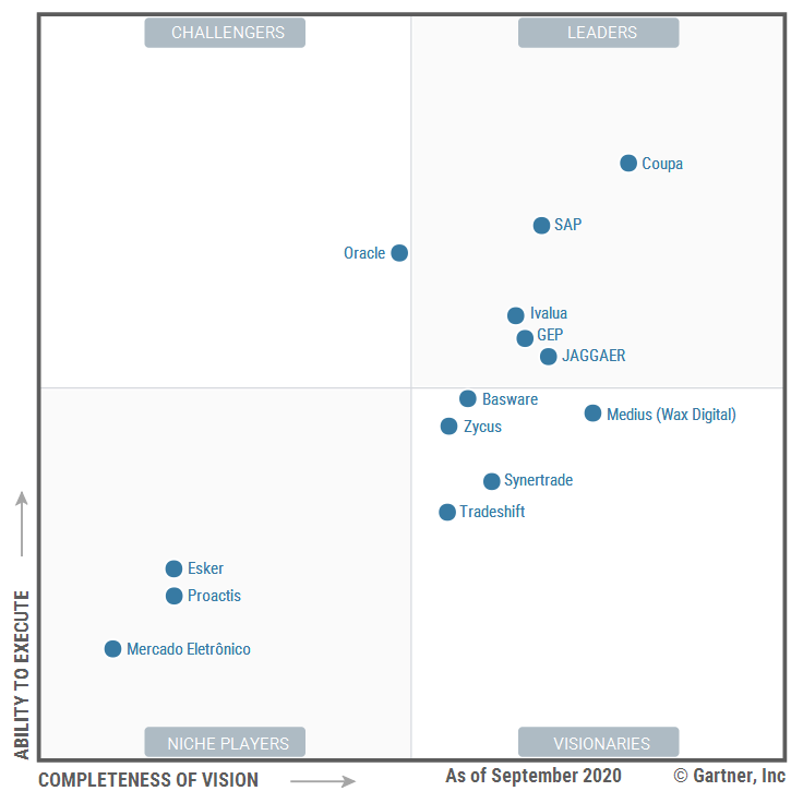 據(jù) Gartner 稱,“削減開(kāi)支、增強(qiáng)合規(guī)性和提高效率的壓力正在不斷增加,這激起了人們對(duì)采購(gòu)到付款(P2P)套件市場(chǎng)的興趣?!盙artner 將 P2P 套件市場(chǎng)定義為一個(gè)集成的解決方案,該解決方案具有自動(dòng)化的工作流程,可以在整個(gè)企業(yè)范圍內(nèi)發(fā)出請(qǐng)求、采購(gòu)、接收和支付商品和服務(wù)。P2P 套件優(yōu)化了采購(gòu)流程,從而改善了財(cái)務(wù)控制、流程合規(guī)性、成本節(jié)約(或成本規(guī)避)并降低了風(fēng)險(xiǎn)。Gartner 根據(jù)15項(xiàng)標(biāo)準(zhǔn)評(píng)估了14家 P2P 套件提供商,并根據(jù)其愿景的完整性和執(zhí)行能力將 SAP 置于領(lǐng)導(dǎo)者象限。