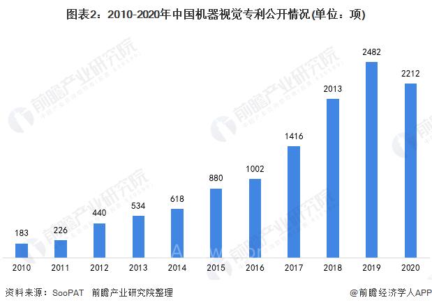 2010年,我國機(jī)器視覺相關(guān)專利公開數(shù)量為183項,至2019年,公開數(shù)量達(dá)到2482項。截至2020年10月21日,與機(jī)器視覺相關(guān)的專利公開量為2212項。
