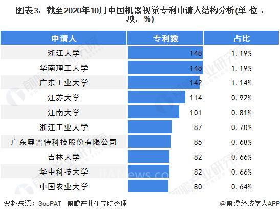 從我國機(jī)器視覺技術(shù)申請人構(gòu)成來看,大學(xué)高校是機(jī)器視覺技術(shù)研發(fā)的主力軍。截至2020年10月21日,前十位申請人中九位是高校,其中浙江大學(xué)和華南理工大學(xué)最多均為148項,均占比1.19%,廣東工業(yè)大學(xué)申請專利數(shù)量排第三,為142項,占比1.14%。