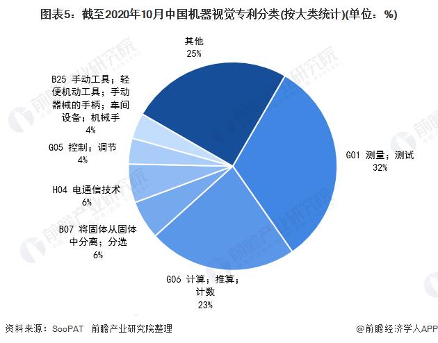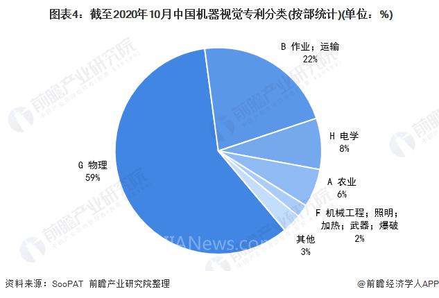 從我國機(jī)器視覺部類構(gòu)成來看,G(物理)部類是機(jī)器視覺技術(shù)的主要類別,占據(jù)近六成的比例。截至2020年10月21日,部類中G(物理)占比為59%,其次為B(作業(yè);運(yùn)輸)占比22%,H(電學(xué))占比8%,A(農(nóng)業(yè))占比6%。