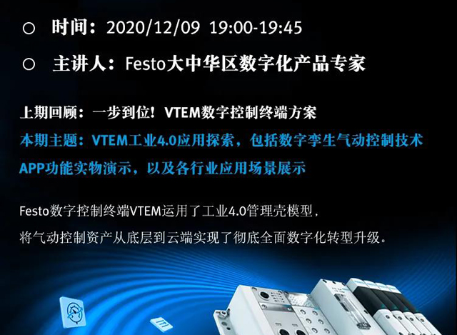 別急,高光時刻即將上演!12月9日 19:00-19:45,費斯托自動“話”直播重磅來襲。本場直播將聚焦VTEM行業(yè)應用,為身處數(shù)字化轉型路口的你帶來福音!