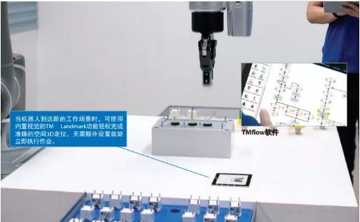 當(dāng)機(jī)器人到達(dá)新的工作場(chǎng)景時(shí),可使用內(nèi)置視覺的TM Landmark功能輕松完成準(zhǔn)確的空間3D定位,無需額外設(shè)置就能立即執(zhí)行作業(yè)。