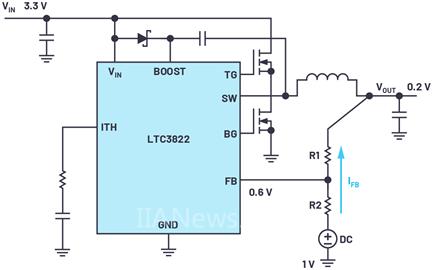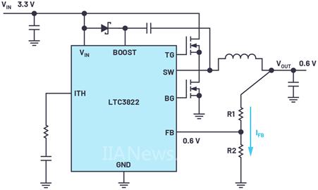 多年以來,線性穩(wěn)壓器和開關(guān)穩(wěn)壓器一直采用約1.2 V的反饋電壓。此電壓由DC-DC轉(zhuǎn)換器IC中的帶隙電路產(chǎn)生,它確定了使用外部電阻分壓器可以設(shè)置的最低電壓。到目前為止,大多數(shù)現(xiàn)代穩(wěn)壓器IC都可以產(chǎn)生0.8 V、0.6 V甚至0.5 V的輸出電壓。內(nèi)部基準(zhǔn)電壓源也按這種方式設(shè)計(jì),所以能夠獲得更低的電壓。圖1所示為這種類型的開關(guān)穩(wěn)壓器 LTC3822,它以0.6 V的基準(zhǔn)電壓產(chǎn)生0.6 V的反饋電壓。