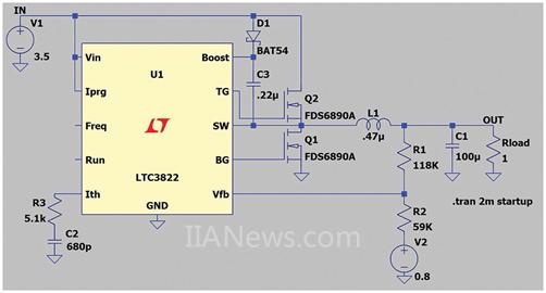 如果要以低于IC制造商指定的輸出電壓運(yùn)行線性穩(wěn)壓器或開關(guān)穩(wěn)壓器,使用仿真工具(例如ADI的LTspice)進(jìn)行初始檢查是非常有用的。圖3顯示了一個(gè)LTC3822構(gòu)成的電路,使用額外的電壓源作為反饋路徑的偏置。在這個(gè)電路中,產(chǎn)生一個(gè)200 mV輸出電壓。根據(jù)數(shù)據(jù)手冊(cè),LTC3822適用于產(chǎn)生最低0.6 V的輸出電壓。在電路中,輔助電壓源(圖3中的電壓源V2)可以通過LDO穩(wěn)壓器或基準(zhǔn)電壓源實(shí)現(xiàn)。利用本文所述的技巧,對(duì)電路進(jìn)行完全測(cè)試,甚至可能產(chǎn)生更低的輸出電壓。