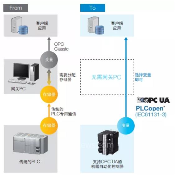 傳統(tǒng)的PLC需要使用網(wǎng)關(guān)PC連接上位系統(tǒng),必須注冊(cè)變量并分配存儲(chǔ)器。而歐姆龍支持OPC UA的CPU單元無需PC,只需選擇變量簡(jiǎn)單進(jìn)行設(shè)定,即可直接連接上位IT系統(tǒng)。