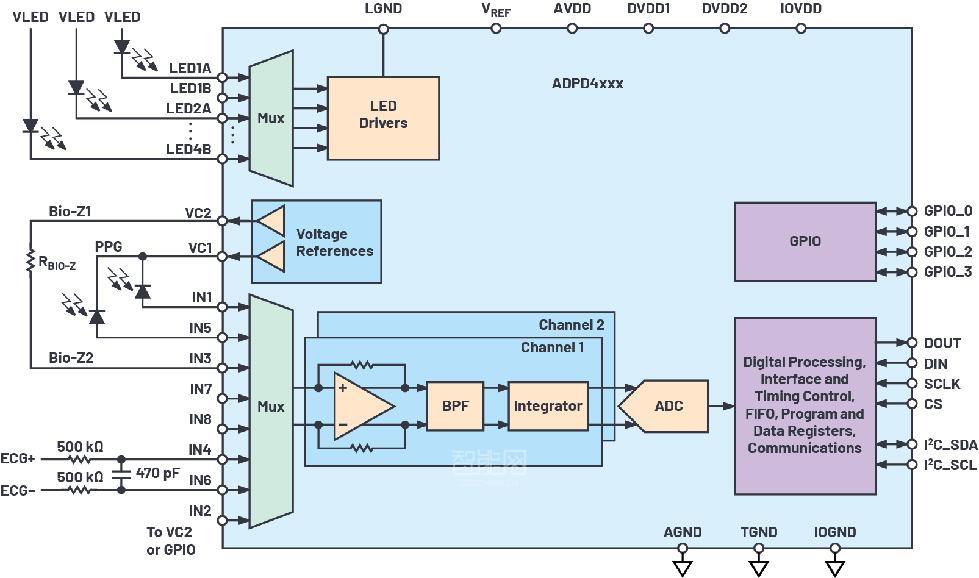市場上有許多可組合兩個或多個測量結(jié)果的多參數(shù)系統(tǒng)。考慮將心率監(jiān)護(hù)儀與運(yùn)動傳感器結(jié)合使用,可以進(jìn)行活動跟蹤,或利用阻抗檢測進(jìn)行心率變異性跟蹤,可用于壓力監(jiān)測或睡眠分析等應(yīng)用。在大多數(shù)情況下,每次測量都由專用模擬前端執(zhí)行,因此需要多個芯片,每個芯片都有各自的模數(shù)轉(zhuǎn)換器(ADC)、各自至主處理器的接口以及需去耦的多個電源和基準(zhǔn)電壓。這將導(dǎo)致許多冗余的構(gòu)建模塊,從尺寸和功率角度來看,它并非一個最優(yōu)的系統(tǒng)。在可穿戴系統(tǒng)中,再沒有什么比擁有一個可連接各個傳感器的主信號鏈更方便的了。新型ADPD4000生物醫(yī)學(xué)前端產(chǎn)品系列填補(bǔ)了這一市場空白。圖1顯示了ADPD4xxx系列的高級框圖。該前端圍繞兩個相同的接收通道設(shè)計而成,可以同步進(jìn)行采樣。每個通道均以差分方式構(gòu)建,因此可以在單端或差分測量模式下測量任何傳感器輸入。輸入級是一個具有可編程增益的跨阻放大器,其后接一個帶通濾波器和一個積分器,能夠進(jìn)行每個采樣7.5 pC的積分。其ADC是一款14位逐次逼近寄存器(SAR)轉(zhuǎn)換器,最大采樣速率為1 MSPS。每個信號鏈的前面是一個8通道多路復(fù)用器,使模擬前端可以靈活地將各種傳感器信號路由至AFE。