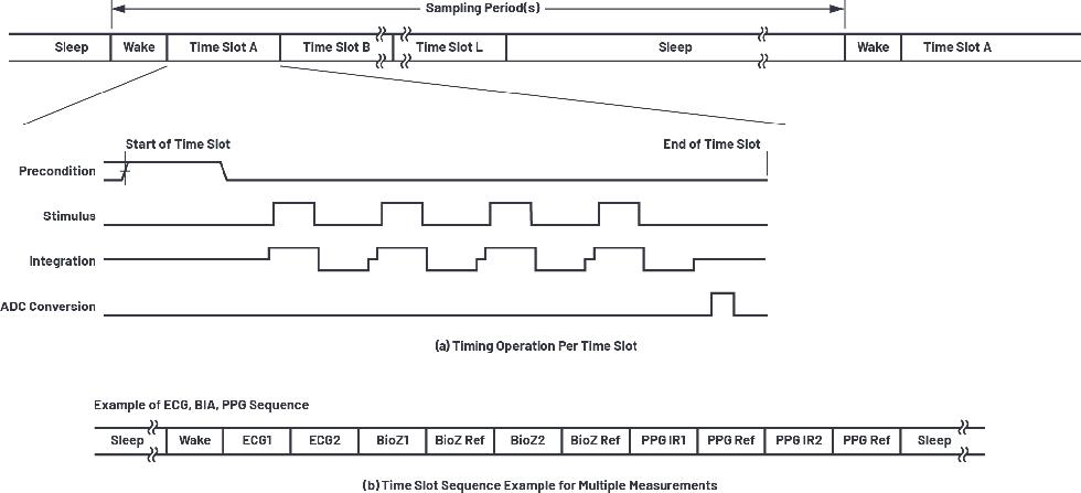 圖3b顯示了工作時序的示例。上電后,進(jìn)行復(fù)位操作,芯片進(jìn)入睡眠模式。芯片喚醒后,可以依次采樣兩個ECG信號(例如,LEAD I和LEAD II),然后進(jìn)行光學(xué)測量以獲取SpO2讀數(shù),并進(jìn)行阻抗測量以測量皮膚電導(dǎo)率(EDA/壓力)。下面章節(jié)將介紹獲得這些測量值的過程。