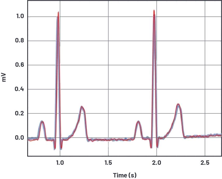 圖4顯示了兩個ECG波形。藍(lán)色波形測量結(jié)果采用高質(zhì)量電極,其串聯(lián)阻抗為51 kΩ,電容為47 nF。而紅色波形測量結(jié)果則采用質(zhì)量較差的高串聯(lián)阻抗電極。其接觸阻抗為510 kΩ,電容為4.7 nF。我們可以看到,ADPD4000測得的兩個波形幾乎完全相同,而與電極質(zhì)量無關(guān)。與市場上的替代解決方案相比,這是該前端的巨大優(yōu)勢。另一個優(yōu)勢是該電路具有極高的功效比,因為在充電電容上捕獲ECG信號時不必激活該電路。再一個優(yōu)點(diǎn)是其功耗僅為150 μW至200 μW。