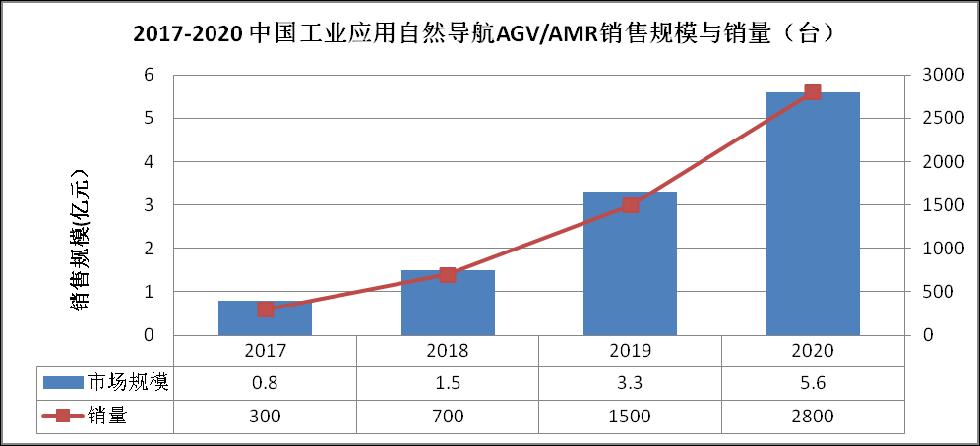 2017-2020中國工業(yè)應用自然導航AGV/AMR銷售規(guī)模與銷量(摘自《2021-2022工業(yè)制造領域AMR機器人產(chǎn)業(yè)發(fā)展研究報告》)