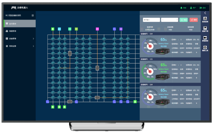 RCS-2000運(yùn)行監(jiān)控功能模塊,能夠根據(jù)每個(gè)機(jī)器人的歷史情況和當(dāng)前狀態(tài)(包括:在線狀態(tài)、負(fù)載狀態(tài)、工作狀態(tài)、任務(wù)狀態(tài)、位置坐標(biāo)、電池電量等信息),來決定是否需要進(jìn)行具體項(xiàng)目的保養(yǎng)維護(hù),并結(jié)合充電站的運(yùn)行狀態(tài)和當(dāng)前的任務(wù)執(zhí)行情況,合理的安排有需要的機(jī)器人進(jìn)行自主充電,補(bǔ)充能源,并記錄分析和匯總?cè)繖C(jī)器人的告警信息,及時(shí)通知運(yùn)維人員,給出相應(yīng)的檢查和處理的建議,保障整個(gè)系統(tǒng)運(yùn)行的可靠性。