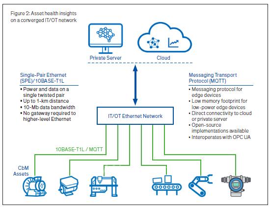由IEEE制定的新單對(duì)以太網(wǎng)(SPE)物理層標(biāo)準(zhǔn)為傳輸資產(chǎn)運(yùn)行狀況信息,實(shí)施狀態(tài)監(jiān)控應(yīng)用提供了新的連接解決方案。10BASE-T1L是在2019年11月7日經(jīng)過(guò)IEEE認(rèn)證的新以太網(wǎng)物理層標(biāo)準(zhǔn)(IEEE 802.3cg-2019)。這將通過(guò)與現(xiàn)場(chǎng)級(jí)器件的無(wú)縫以太網(wǎng)連接顯著提高工廠運(yùn)營(yíng)效率,變革自動(dòng)化行業(yè)。10BASE-T1L解決了至今為止一直限制現(xiàn)場(chǎng)使用以太網(wǎng)的挑戰(zhàn)。這些挑戰(zhàn)包括功率、帶寬、布線、距離、數(shù)據(jù)島以及本質(zhì)安全0區(qū)(危險(xiǎn)區(qū)域)應(yīng)用。通過(guò)解決后裝升級(jí)以及前裝安裝的挑戰(zhàn),10BASE-T1L將有助于獲得以前無(wú)法獲取的新資產(chǎn)運(yùn)行狀況信息,并將它們無(wú)縫傳送給控制層、云/私人服務(wù)器。這些新的見解將通過(guò)從現(xiàn)場(chǎng)資產(chǎn)到云或私人服務(wù)器的融合以太網(wǎng)網(wǎng)絡(luò)(請(qǐng)參見圖2),讓數(shù)據(jù)分析、運(yùn)營(yíng)見解和生產(chǎn)力提高成為可能。