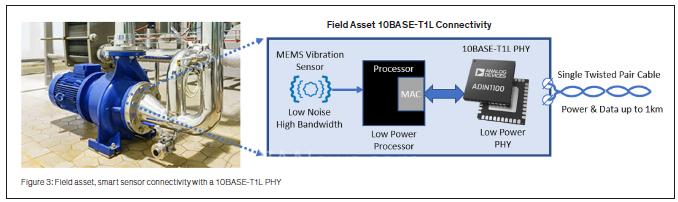 ADIN1100(ADI的10BASE-T1L PHY)可以在超過(guò)1200米長(zhǎng)的單條雙絞線上實(shí)現(xiàn)更低功耗的以太網(wǎng)連接,其功耗僅為39 mW。采用10BASE-T1L之后,可在單條雙絞線上同時(shí)提供功率和數(shù)據(jù)。10-Mb數(shù)據(jù)帶寬通信鏈路可在同一條電纜上傳輸大量功率,為現(xiàn)場(chǎng)資產(chǎn)提供智能傳感器、功率和連接帶寬,以實(shí)現(xiàn)新型狀態(tài)監(jiān)控應(yīng)用。采用10BASE-T1L連接之后,獲取資產(chǎn)運(yùn)行狀況信息變得更加容易,因?yàn)檫@些信息現(xiàn)在可通過(guò)融合IT/OT以太網(wǎng)網(wǎng)絡(luò)獲取。10BASE-T1L可在危險(xiǎn)區(qū)域內(nèi)使用(本質(zhì)安全區(qū)域0),用于實(shí)施過(guò)程自動(dòng)化部署,有時(shí)候被稱為以太網(wǎng)APL。10BASE-T1L/以太網(wǎng)APL將提供新的低功耗連接解決方案,將資產(chǎn)運(yùn)行狀況監(jiān)測(cè)智能傳感器連接到用于實(shí)施AI和高級(jí)分析的高級(jí)數(shù)據(jù)管理系統(tǒng),從而將資產(chǎn)運(yùn)行狀況數(shù)據(jù)轉(zhuǎn)換為可操作的信息,以部署新的預(yù)測(cè)維護(hù)服務(wù)。