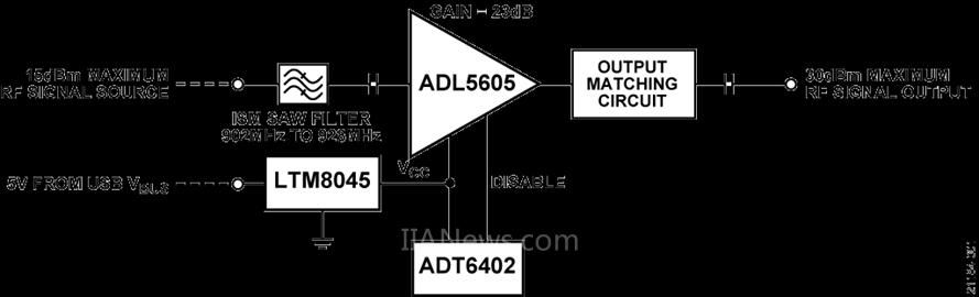 但是,無論何種應(yīng)用,該頻段中的無線電傳輸都要求信號(hào)鏈電路之后有一個(gè)放大器模塊來驅(qū)動(dòng)天線。在美國(guó),根據(jù)FCC的規(guī)定,對(duì)于使用直接序列擴(kuò)頻(DSSS)或跳頻擴(kuò)頻(FHSS)的50通道無線電系統(tǒng),以及對(duì)于使用FHSS的少于50個(gè)通道的無線電系統(tǒng),采用915 MHz ISM頻段的擴(kuò)頻發(fā)射機(jī)的最大峰值輸出功率分別為36 dBm和30 dBm。