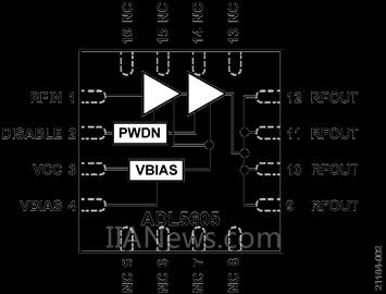 ADI公司的兩級(jí)RF功率放大器 ADL5605的工作頻率范圍為700 MHz至1 GHz,典型增益為23.0 dB,最小噪聲系數(shù)為4.7 dB,從881 MHz±13 MHz開始的最小輸出三階交調(diào)截點(diǎn)(IP3)為43.4 dBm。