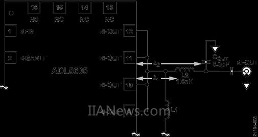 對(duì)于915 MHz ISM頻段,ADL5605的RFIN引腳上不需要外部匹配元件。同時(shí),使用微帶線作為電感,并連接一個(gè)額外的串聯(lián)電感(L2)和一個(gè)并聯(lián)電容(COUT),即可將其RFOUT引腳輕松匹配至50Ω。RFIN和RFOUT引腳均需要外部隔直流電容。