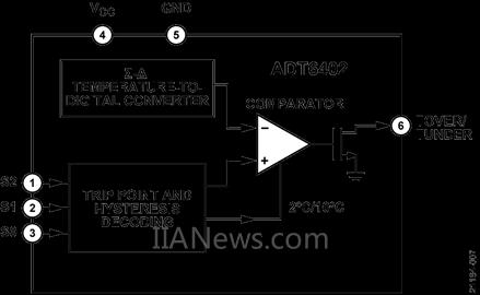 如果使用HMC450,則溫度開關(guān)必須替換為ADT6401,其與ADT6402引腳兼容且有相同的規(guī)格,但輸出為低電平有效輸出。