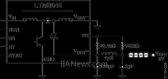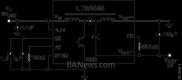 對(duì)于5 V的輸入和輸出電壓電平,根據(jù)數(shù)據(jù)手冊(cè)所述,LTM8045的最佳開關(guān)頻率為800 kHz。將此值代入公式2中的fOSC,可計(jì)算出外部電阻值為115 kΩ。對(duì)于該配置,推薦的輸入和輸出電容分別為4.7μF和100μF。
