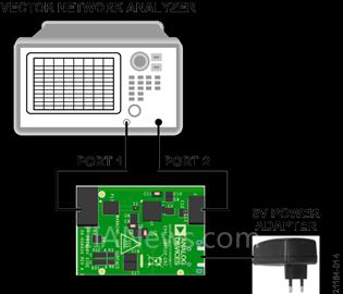 4.使用校準(zhǔn)的測(cè)試設(shè)置將EVAL-CN0522-EBZ連接在矢量網(wǎng)絡(luò)分析儀的測(cè)試端口上。