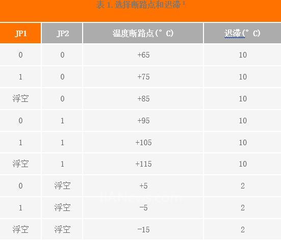 S0、S1和S2引腳的狀態(tài)選擇ADT6402的溫度斷路點(diǎn)和遲滯。CN-0522的引腳S2硬連線至VCC,而引腳S0和S1可利用焊接跳線JP1和JP2連接至VCC或GND(或保持浮空)。這些引腳配置將溫度斷路點(diǎn)和遲滯選項(xiàng)限制為表1所列的選項(xiàng)。