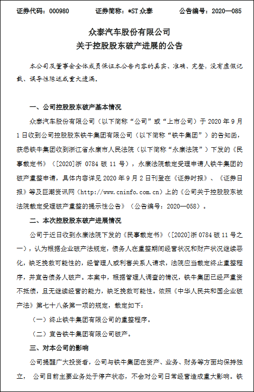 為了減輕母公司破產(chǎn)對(duì)眾泰汽車的負(fù)面影響,眾泰汽車還在公告中稱,公司與鐵牛集團(tuán)在資產(chǎn)、業(yè)務(wù)、財(cái)務(wù)等方面均保持獨(dú)立,目前主要業(yè)務(wù)處于停產(chǎn)狀態(tài),不會(huì)對(duì)其日常經(jīng)營(yíng)造成重大影響。鐵牛集團(tuán)破產(chǎn)后續(xù)處置可能會(huì)引起本公司實(shí)際控制權(quán)的變化。
