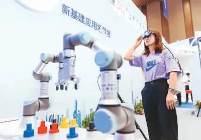 參觀者在江蘇省南通市新基建應用場景展上體驗通過基于5G的人工智能技術操控機械臂。來源:人民圖片
