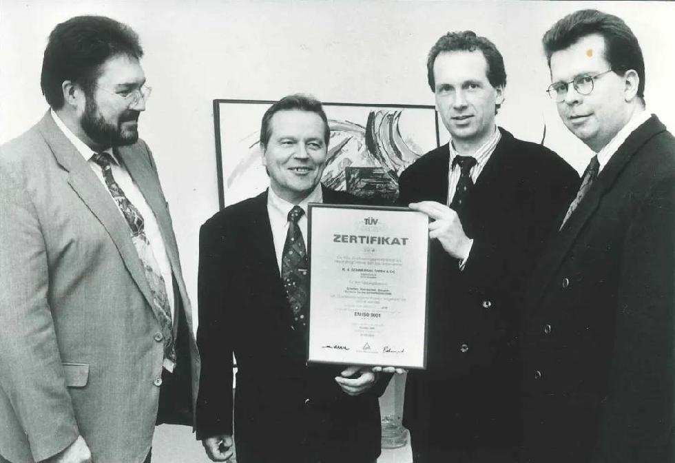 來自德國萊茵TüV的兩位先生向Dieter Halbach(前質(zhì)量經(jīng)理)和Heinz Schmersa先生l頒發(fā)了ISO認(rèn)證證書